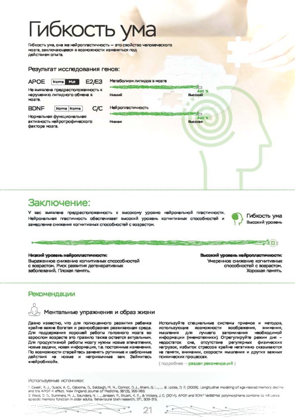 Этот ДНК анализ показывает влияние наиболее важных 10 генов на психическое и эмоциональное состояние. Именно они регулируют выработку гормонов, работу нейромедиаторов. Используйте знания о природных свойствах своего организма для борьбы со стрессом, повышения работоспособности и общего тонуса. Каждый человек индивидуален, поэтому мы рекомендуем пройти наш генетический нейро тест в Чулыме.